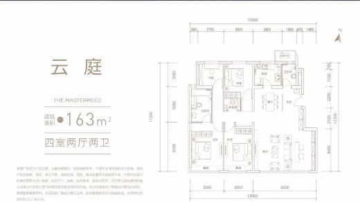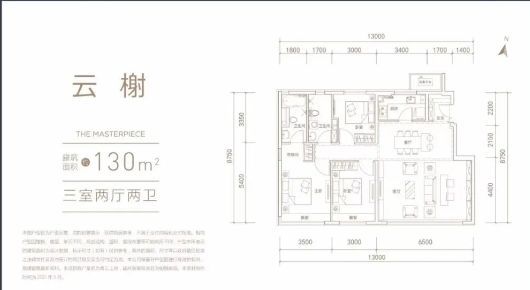 建面约130㎡三居户型为顶层退台与四居户型大致结构类似,全明通透户型,动静分区格局,双卫设计。南侧面宽相同,三个南向面宽的尺寸也相同,同样是双卧+客厅朝南向,客厅面宽约6.5米。进深较四居户型短,采光视野极佳。